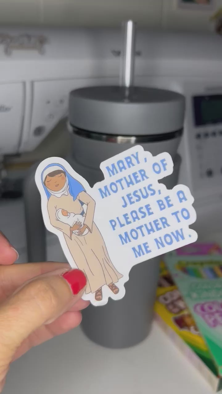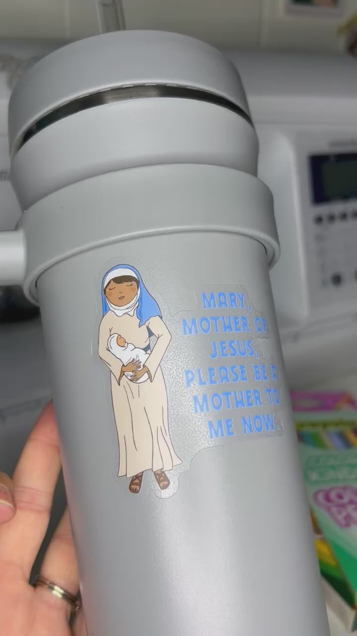 The prayer "Mary, Mother of Jesus, please Be a Mother to me now" is attributed to Mother Teresa, a saint known for her charitable work and profound spirituality. this appeal for Mary’s mothering spirit to embrace us reminds me of Jesus, when he says on the cross, “Behold your mother.” The motherhood of Mary is meant to embrace us all as we look to her Son. With this sticker, you can carry this powerful message with you wherever you go.