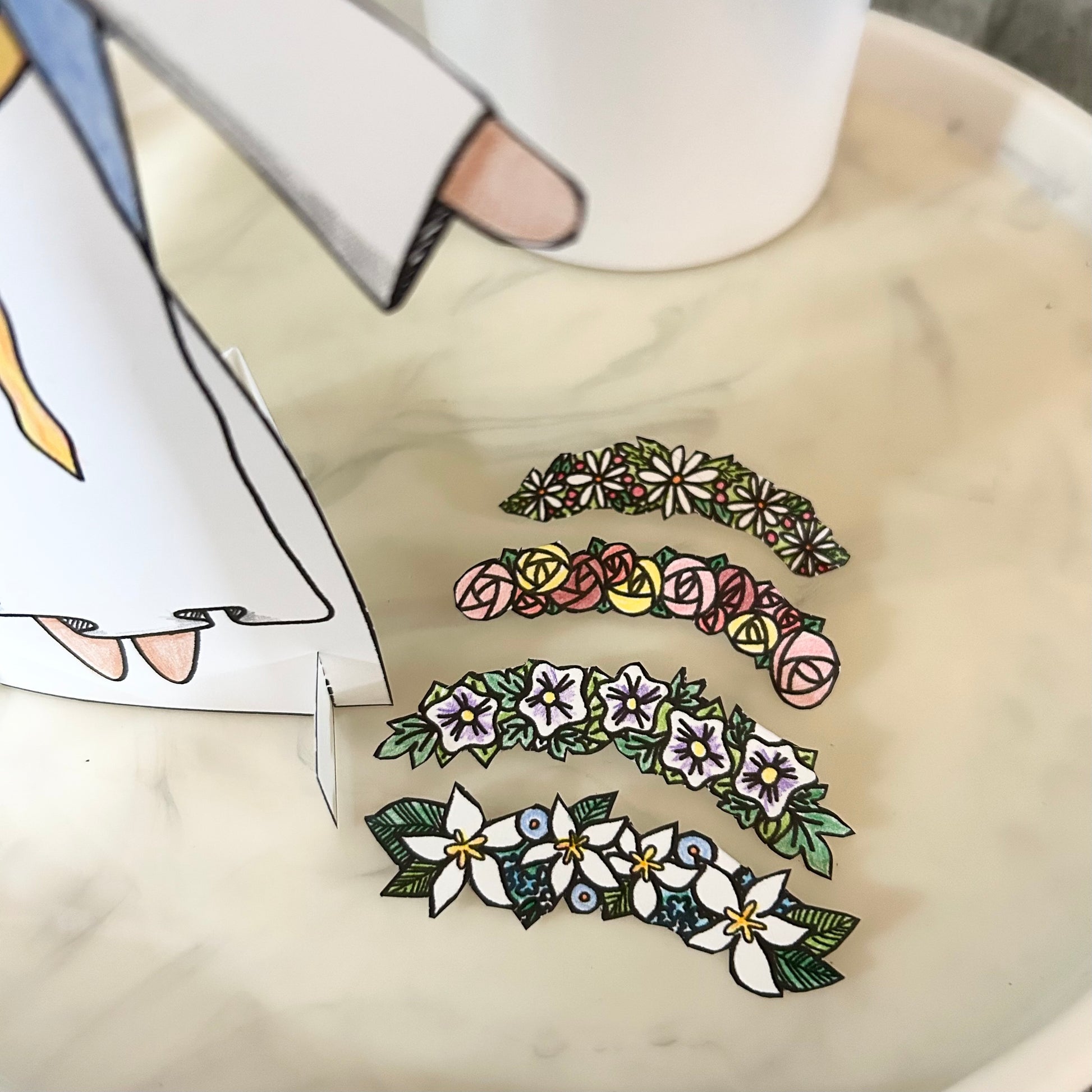 RECOMMENDATIONS: I recommend printing on Cardstock paper as this is more sturdy and will stand up nicely for you. Small children may need some assistance cutting out the flower crowns and help learning how to fold the tabs to place the crowns on Mary’s head.